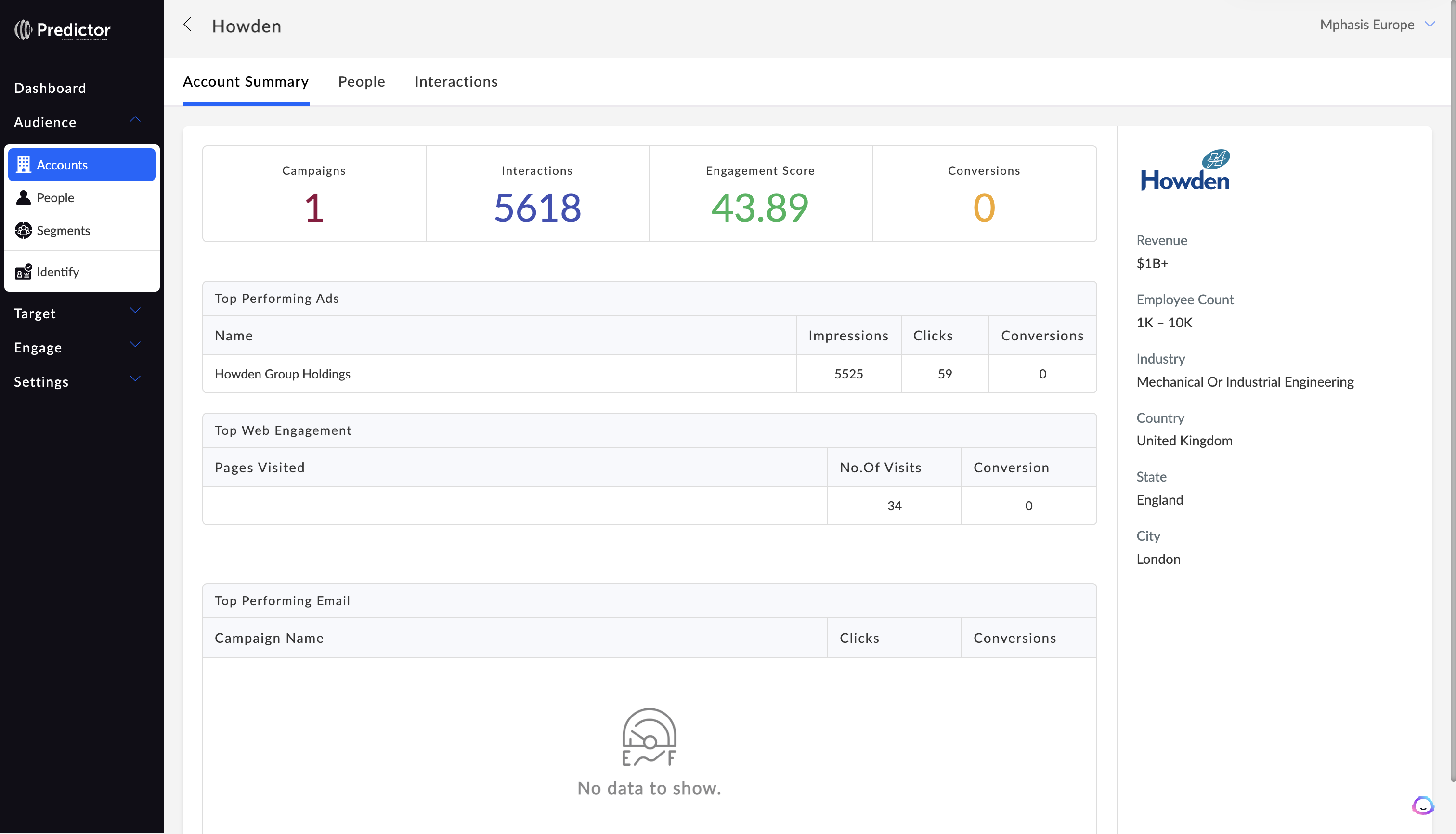 Serving highly targeted ads from the target accounts to the appropriate people based on engagement, intent, and CRM data are some examples of marketing qualities. Utilize it in conjunction with PredictorABM's Engage module to dynamically personalise landing pages and increase interaction.